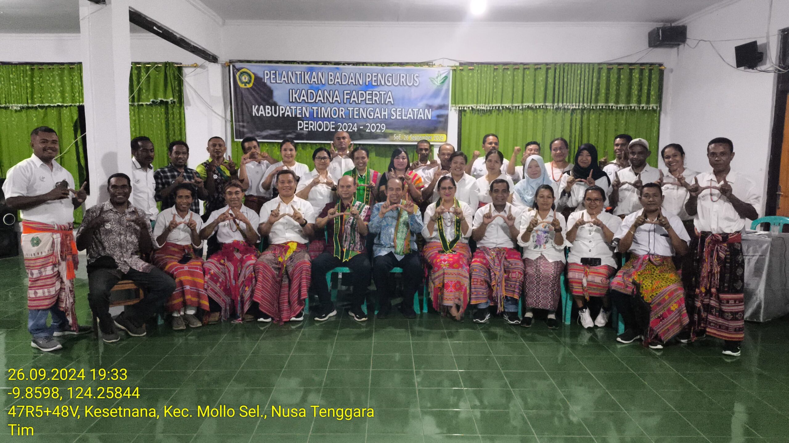 Hadir pada acara pelantikan ini Ketua Ikadana Faperta Provinsi NTT Nixon M. Balukh, SP, M.Si, Wakil Sekretaris Ikadana Faperta Provinsi NTT Saptarina Sulla, SP, Badan Pengurus Alumni dan para Alumni Faperta Undana di Kabupaten TTS. Acara Pelantikan/Pengukuhan dilaksanakan melalui pembacaan naskah pelantikan dan dilanjutkan dengan penyematan pin dan stola Ikadana Faperta oleh Dekan Faperta Undana, dilanjutkan dengan penandatanganan berita acara pelantikan bersama Dekan Faperta Undana, Ketua Ikadana Faperta Provinsi NTT dan Kabupaten TTS serta penyerahan Garis Besar Program Kerja dari Ketua Ikadana Faperta Provinsi NTT kepada Ketua Ikadana Faperta TTS, menyanyikan bersama Mars Turvita Faperta Undana dan Doa Syukur.