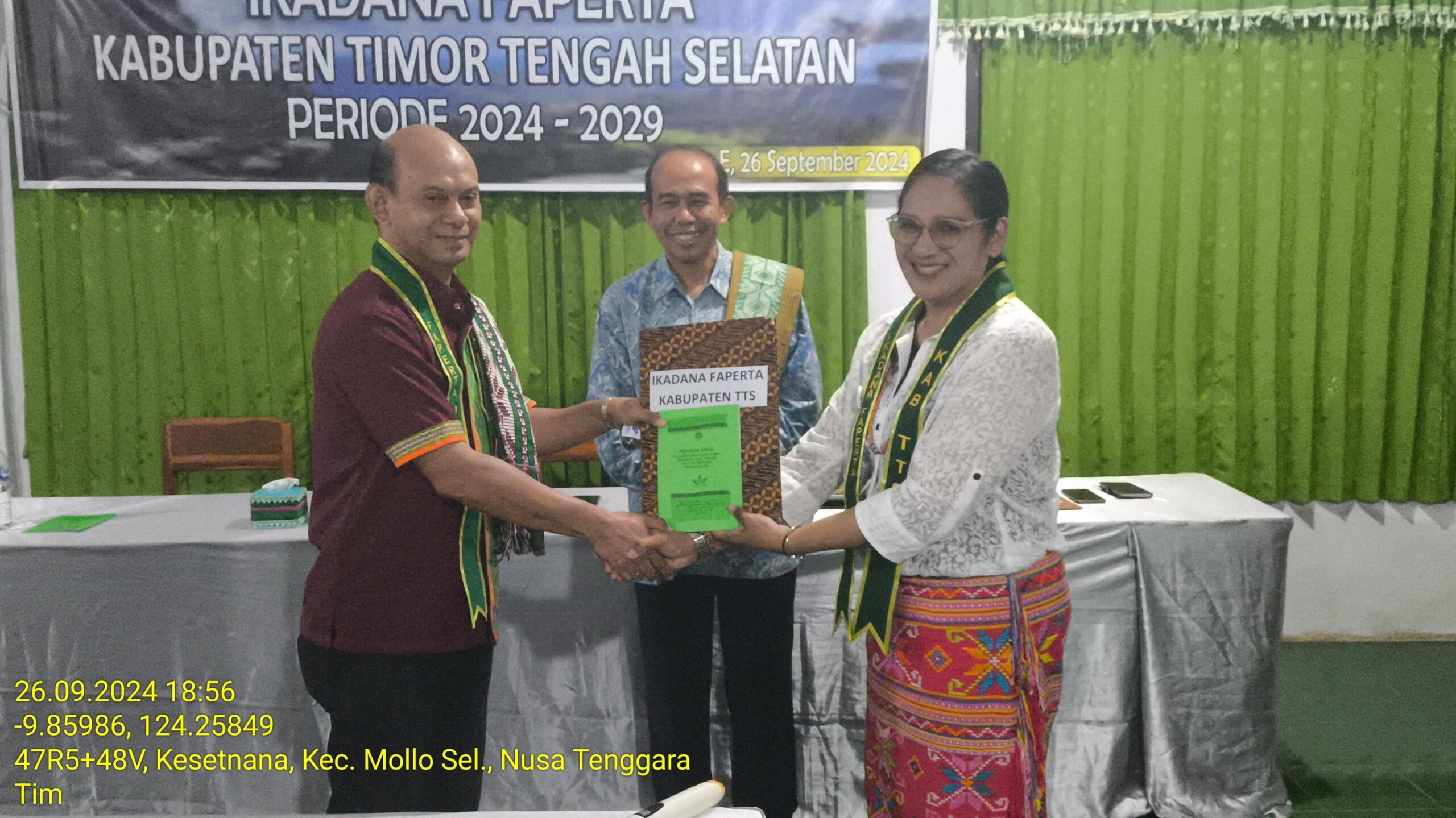 Ketua Ikadana Faperta Kabupaten TTS Esther H. Natty, SP dalam sambutannya menyampaikan terima kasih atas kepercayaan dan tanggung jawab yang diberikan kepada Badan Pengurus Ikadana Faperta Kabupaten TTS sekaligus menyatakan bahwa ini tugas yang berat akan tetapi siap bersama-sama Badan Pengurus dan seluruh alumni Faperta Undana yang berada di kabupaten TTS berkontribusi/berdampak bagi alumni, almamater dan Pembangunan di Kabupaten TTS.