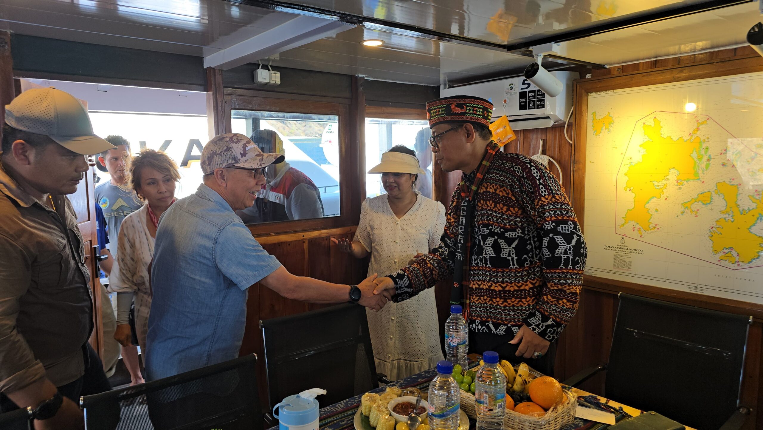 NTT AKTUAL. LABUAN BAJO. Di sela-sela kunjungan ke Pulau Padar dan Pulau Komodo, Penjabat Gubernur NTT, Dr. Andriko Noto Susanto melakukan pertemuan dengan Menteri Industri Pangan, Komoditas dan Pembangunan Regional Serawak Malaysia, Dato Sri Stephen Rundi Anak Utom di atas Kapal Pinishi Milik Balai Taman Nasional Komodo (BTNK), Minggu (20/Oktober/2024). Perkenalan tak terduga dengan Dato Sri Stephen Rundi Anak Utom terjadi saat Pj. Gubernur Andriko melakukan pendakian ke puncak Padar. Pada saat bersamaan Dato Sri Stephen bersama rombongan juga melakukan trekking ke puncak Padar.