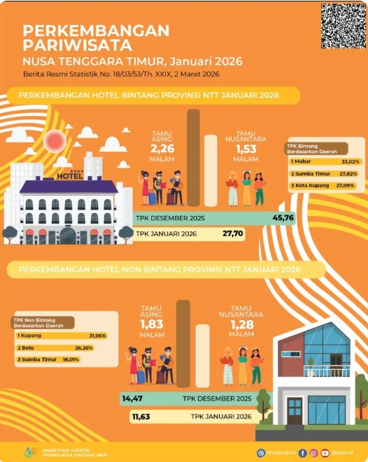 Pada kesempatan ini dirinya juga menyampaikan Tingkat Penghunian Kamar (TPK) di hotel berbintang di Provinsi NTT pada Januari 2026 mencapai 27,70 persen, turun 15,11 persen (y-on-y). (*/NA)